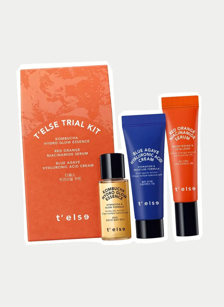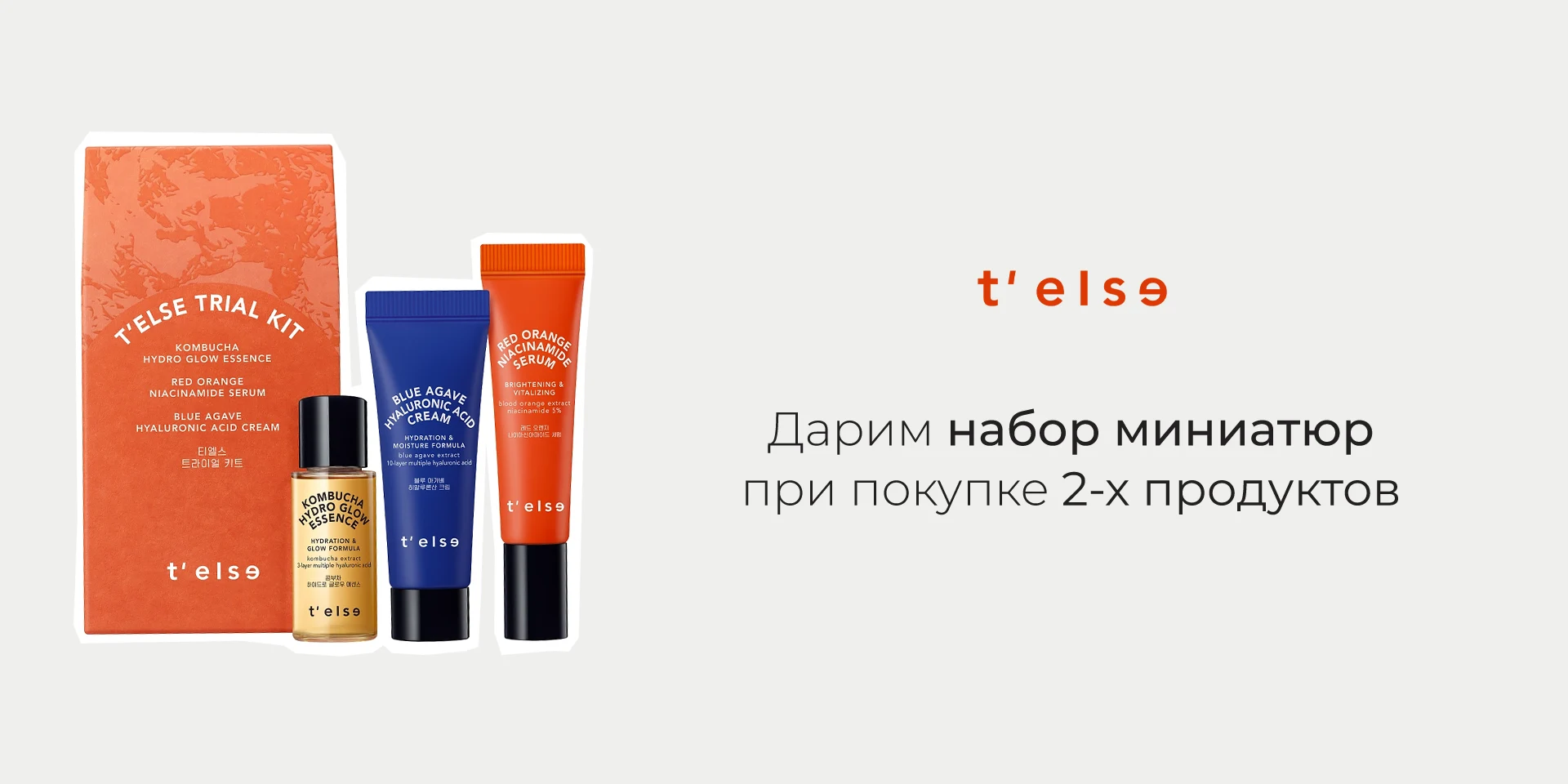 При покупке двух полноразмерных продуктов T'else получите набор миниатюр: эссенция + сыворотка + крем Trial Kit, 8+5+10 мл.
