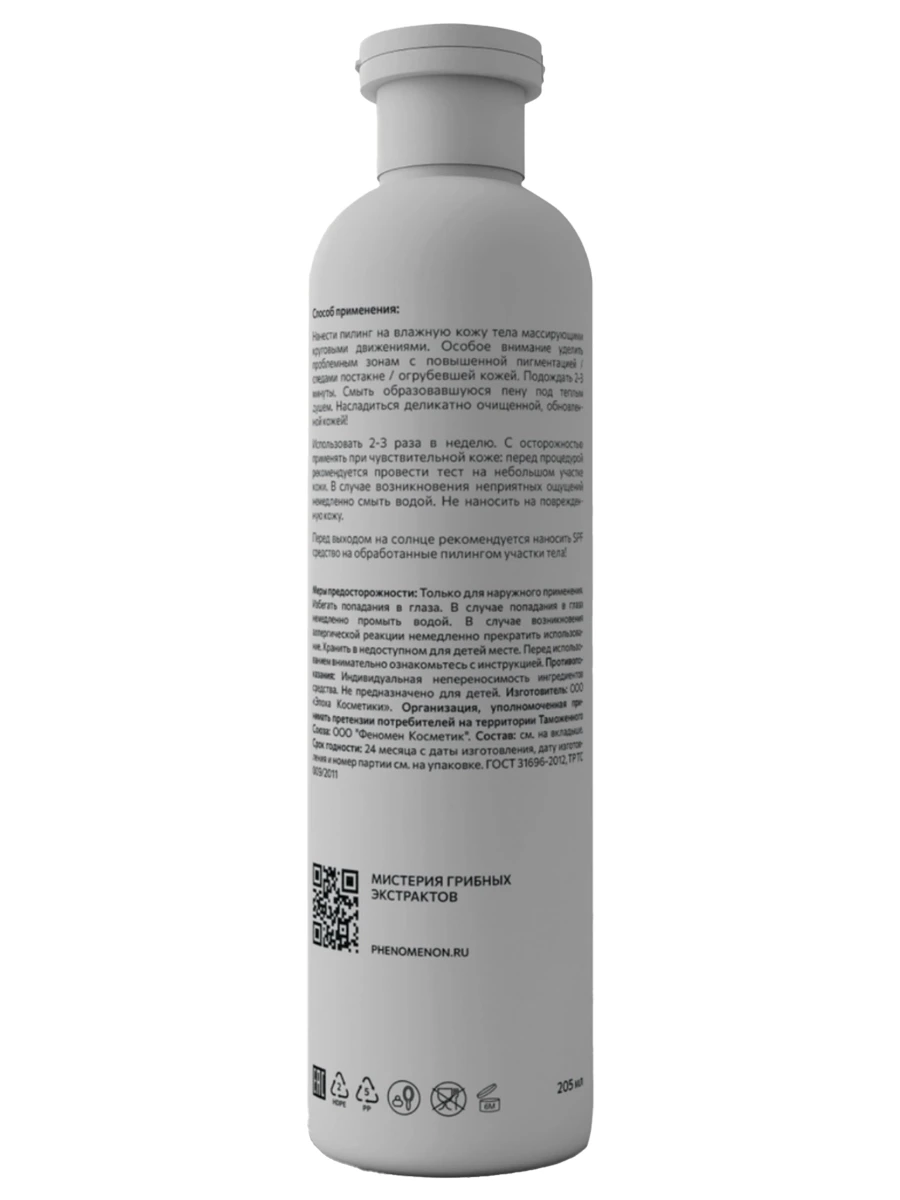 Мягко отшелушивает и обновляет кожу тела, выравнивая тон и текстуру. Содержит комплекс AHA-кислот для эффективной эксфолиации, PHA-кислоту для смягчения и увлажнения, грибные экстракты для восстановления барьера. Осветляет пигментацию и придает коже гладкость с красивым сиянием.