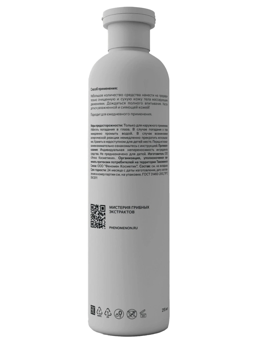 Интенсивно увлажняет и восстанавливает кожу тела, возвращая ей мягкость и упругость. Содержит комплекс масел для глубокого питания, грибные экстракты для регенерации и молочную кислоту для деликатного обновления. Легкая текстура быстро впитывается, не оставляя следов. Подходит для чувствительной кожи.