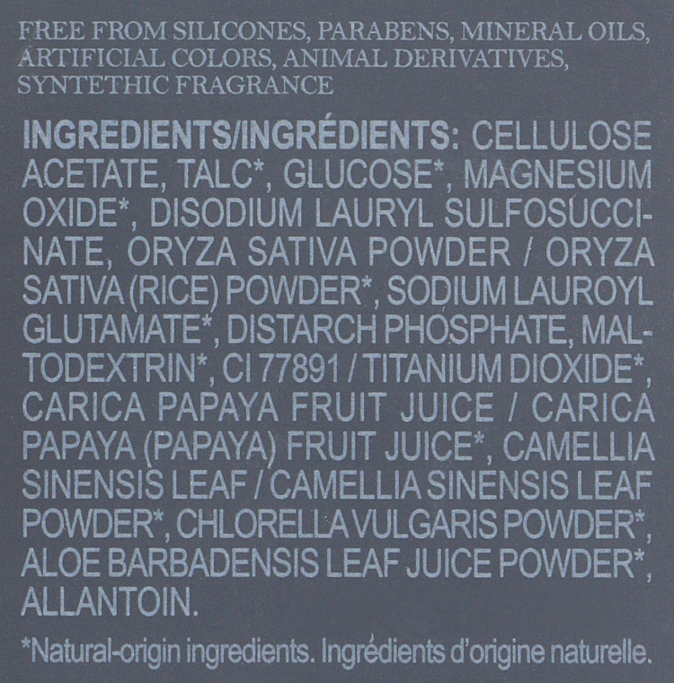 cellulose acetate, talc, glucose, magnesium oxide, disodium lauryl sulfosuccinate, oryza sativa powder / oryza sativa (rice) powder, sodium lauroyl glutamate, distarch phosphate, maltodextrin, ci 77891 / titanium dioxide, carica papaya fruit juice / carica papaya (papaya) fruit juice, camellia sinensis leaf / camellia sinensis leaf powder, chlorella vulgaris powder, aloe barbadensis leaf juice powder, allantoin.