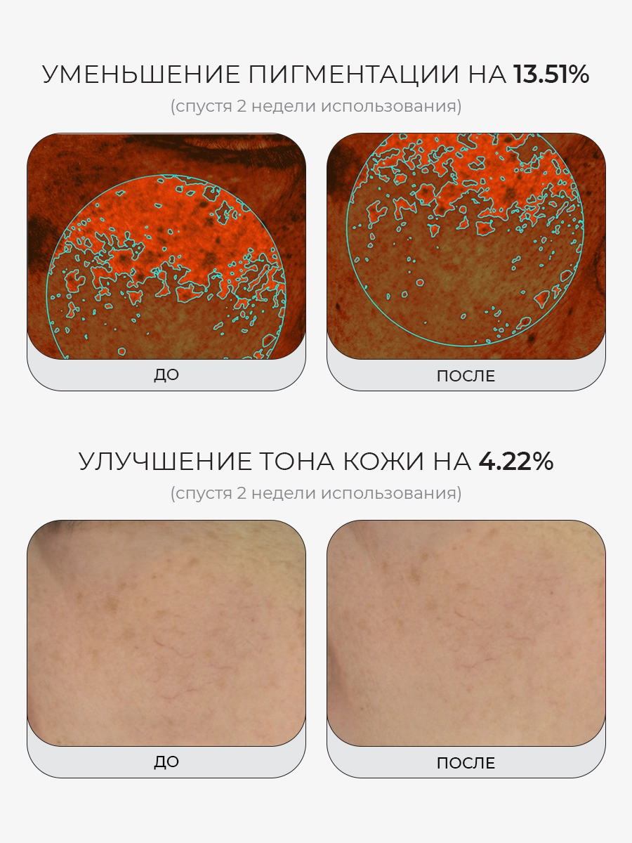 Продукт повышает уровень гидратации на поверхности на 55.9% и в глубоких слоях рогового слоя на 104.1%, избавляет от тусклости и усиливает естественное сияние на 23.1% сразу после 1-го использования, а спустя 2 недели регулярного применения уменьшается площадь пигментных пятен на 13.51%, а тон становится более равномерным на 4.22%.