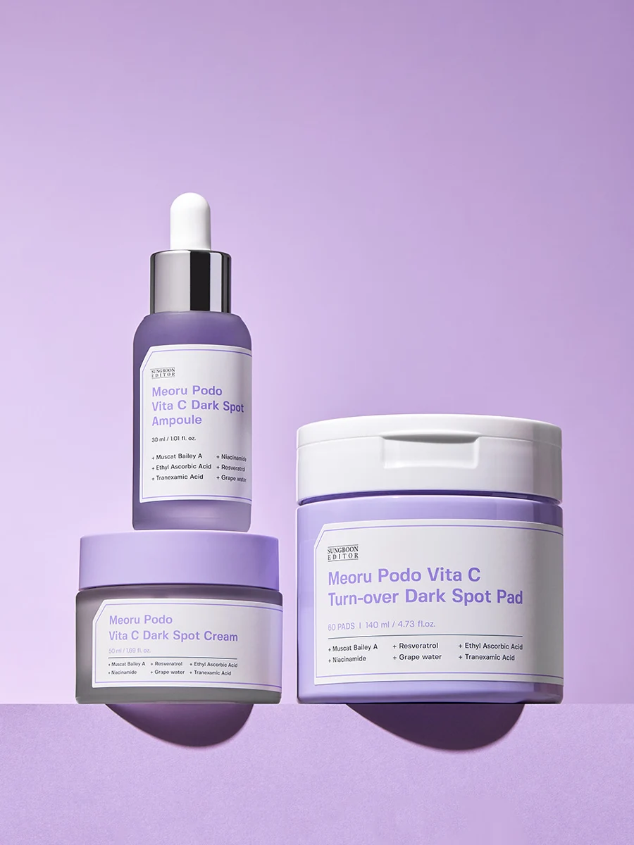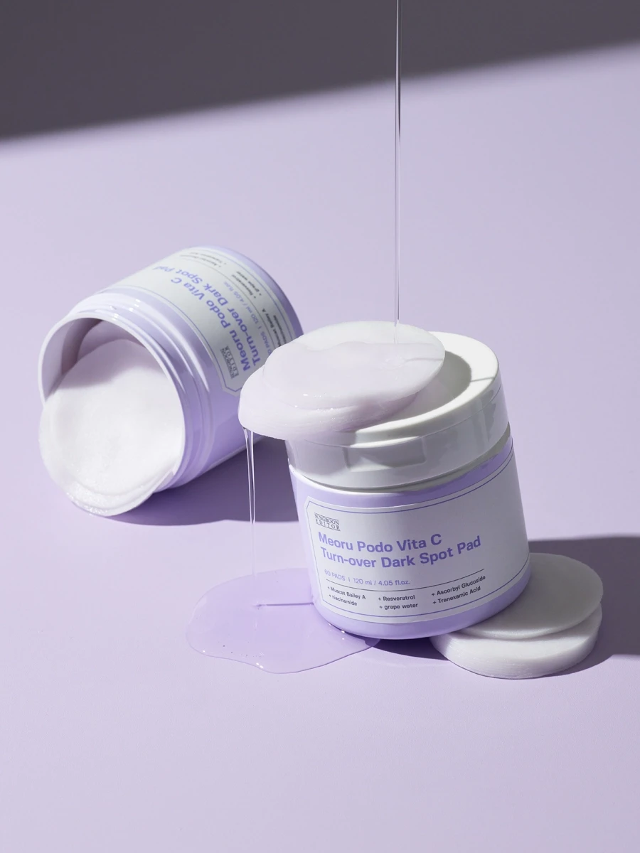 Отшелушивают ороговевшие клетки, выравнивают тон и осветляют пигментацию, сокращают поры и разглаживают микрорельеф. Содержат Meoru Podo Vita C, PHA-кислоту и транексамовую кислоту для осветления и антиоксидантной защиты, ниацинамид для себорегуляции, центеллу и аллантоин для укрепления барьера.