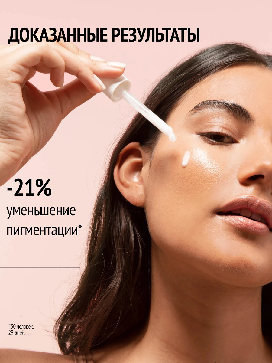 Эффективно уменьшает видимость и количество пигментных пятен, предотвращает их дальнейшее появление, разглаживает общий тон, придает коже красивое свечение изнутри.