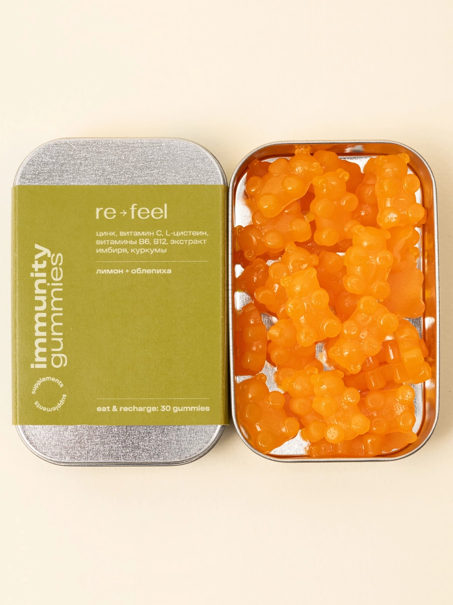 Сок апельсиновый концентрированный, сироп цикория, сок облепиховый концентрированный, сок лимонный концентрированный, вода питьевая, желатин, цитрат натрия, витамин С (аскорбиновая кислота), цинк (цинка бисглицинат), Л-цистеин, бета-каротин, экстракт куркумы, экстракт имбиря, витамин В6 (пиридоксина гидрохлорид), витамин В12 (кобаламин), воск карнаубский.