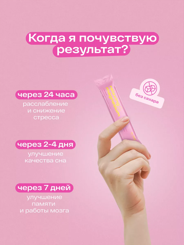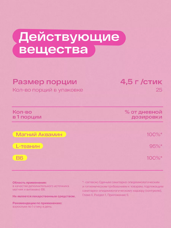В одном стике содержится 100% от дневной нормы магния и витамина B6, а также 96% от дневной нормы L-теанина.