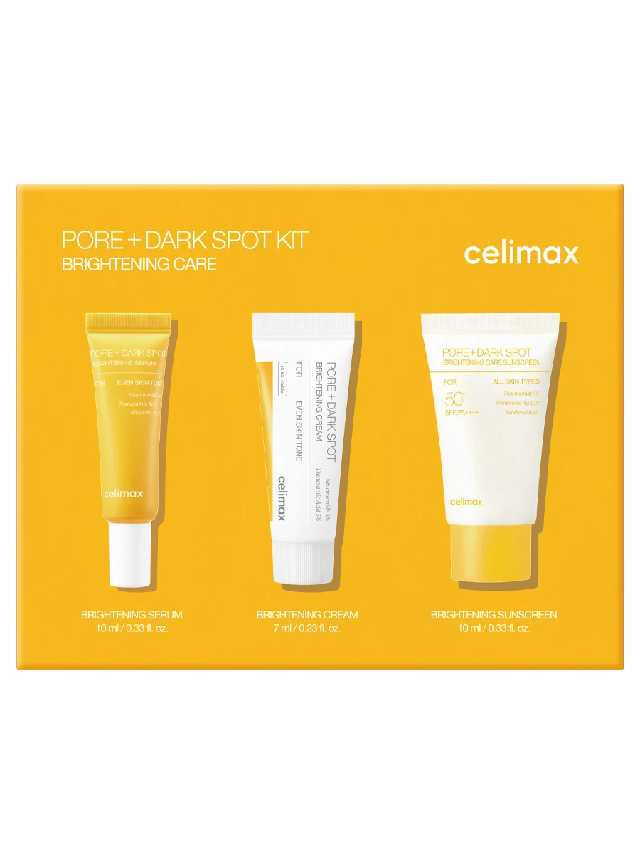 Откройте для себя набор Celimax Pore+Dark Spot Brightening Kit — комплексное решение для безупречного тона и сияния кожи, объединяющее передовые осветляющие технологии и три высокоэффективные формулы для борьбы с пигментацией.