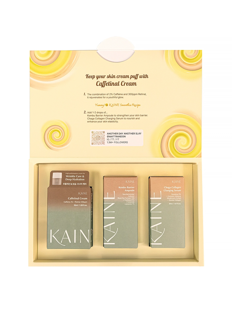 Три бестселлера Kaine в одном наборе: сыворотка с чагой увлажняет и укрепляет, ампула с комбучей восстанавливает барьер, крем с кофеином и ретиналем разглаживает и тонизирует. Мощный уход для здоровой и сияющей кожи!